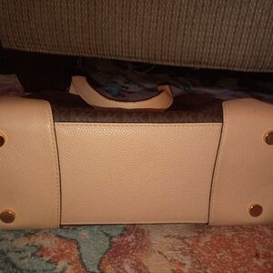 Elegant Michael Kors tote with signature pattern. Brown body with cream accents. Ideal for daily use. 15x11