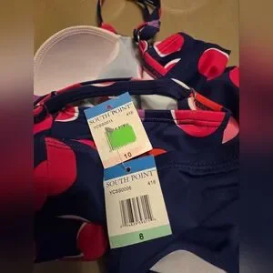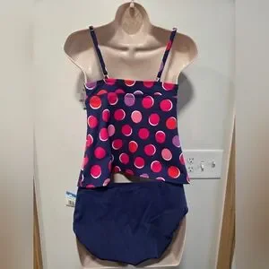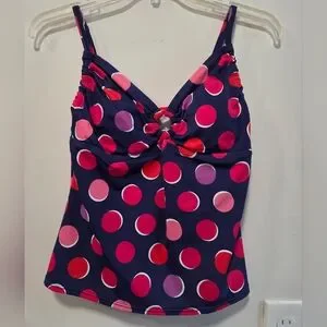 Navy Blue with red, pink, purple Polkadot pattern, Padded bra cups, adjustable straps, tag sz 10, runs small.