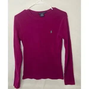 Keywords: Ralph Lauren, pony logo, crew neck, long sleeve, magenta, sporty, athletic, casual wear, layering piece, everyday style, activewear, comfortable, iconic, designer tee