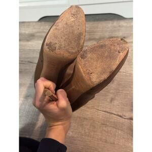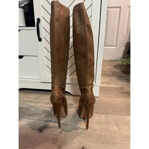 These knee high boots are stunning. Brown smooth leather. Please note, there are marks on the heel area and a faint blemish on the leg- see photos. Stiletto heel and platform bottom. See photos!