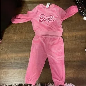 Adorable pink Barbie tracksuit for kids. Features a cozy top and matching pants.