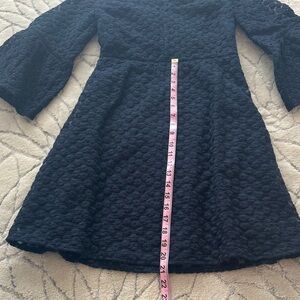 Chic asymmetrical dress with flared sleeves. Textured fabric adds elegance.