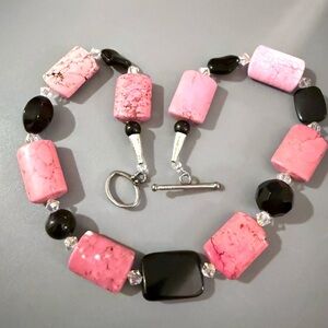 Natural Gemstone BOHO Howlite Pink with Black Statement Necklace 20 Inches