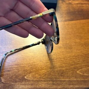 Stylish Warby Parker glasses with a sleek black frame. Subtle green accents add a modern touch. Perfect for everyday wear. Beautiful gray lens and gold hardware detail. Smoke free dog friendly home. No prescription lenses added. No signs of wear.
