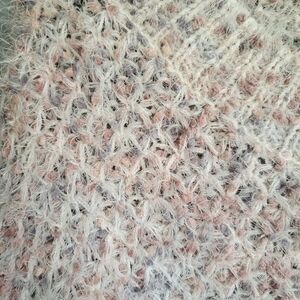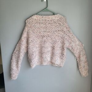 Cream colored "furry" polyester/acrylic long sleeve cropped sweater with neutral colored "marbling". In excellent condition. Approx 21" from armpit to armpit and 19" from shoulder to hem