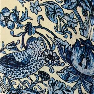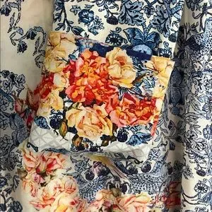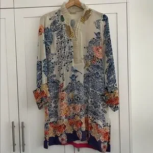 Gorgeous floral tunic from Pakistan designer Farah Talib Aziz, roses, birds, ornate cuffs, side slits, pleats and embroidered jewels at collar. Mix of antique cream, blue, gold, reds and yellows.
