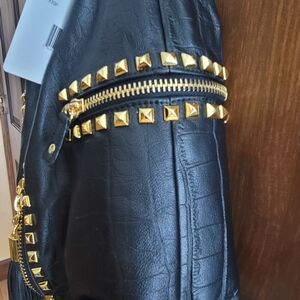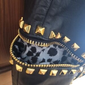 Stylish black bag with gold stud accents. Perfect for adding a touch of elegance to any outfit.