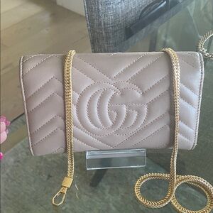 Stylish Gucci clutch in blush quilted leather. Features iconic gold logo and chain strap.like new.