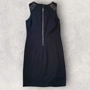 This showstopper Carmen Marc Valvo black sheath dress in Size 4 is a stunning piece with bold lace‑up grommet details along the sides and shoulders. Flattering, structured, and perfect for events, work functions, or a night out.