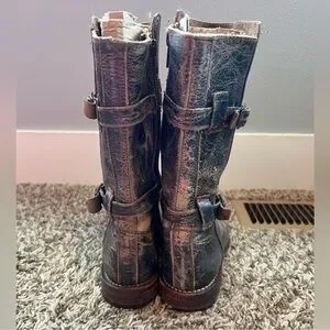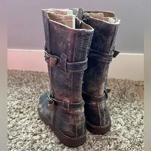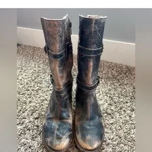 BED STU Leather boots with a distressed finish. Features dual buckle straps.Has some natural distressing and patina to it, 2 buckles around the shaft, zips up the center side, rounded toes and flat heels.In great shape, gently used, no rips or stains and a little wear on the soles.