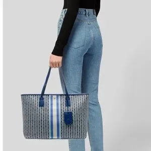 Elegant Tory Burch tote with geometric design. Features navy and white colors. Ideal for daily use.