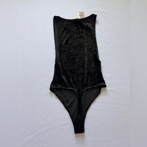 Chic black velvet bodysuit. Soft texture. Ideal for layering.