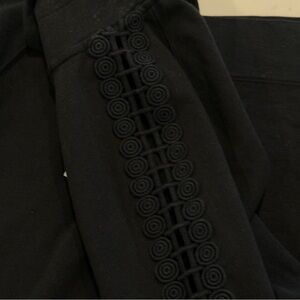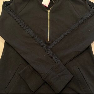 Solid straight skipper pullover dress with half zip neck,novelty zipper pull, functional pockets, and lace trim at sleeves.