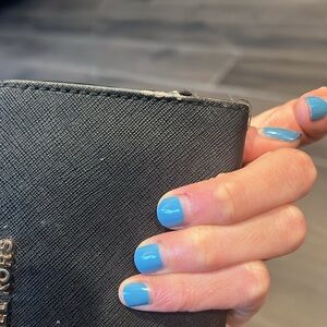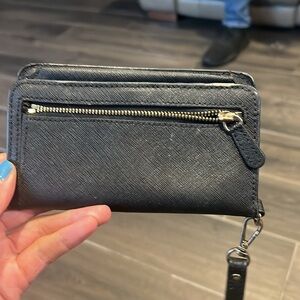 Elegant wristlet by Michael Kors. Features a sleek black design with gold accents. Includes a convenient strap for easy carrying.