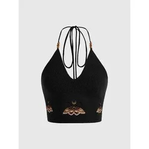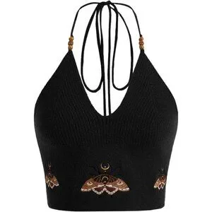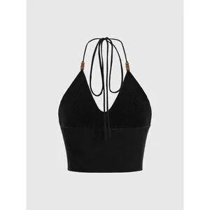 Features: Stylish knitting crop top with crochet halter, shell appliques, hollow out accents, and a tie back closure. Flattering V neck makes it perfect for showing off some skin. Easy to style for a variety of casual or more dressed-up looks.