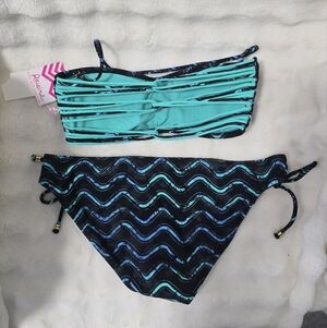 Chic bikini set with wave design. Features black and blue colors. Includes top and bottom with ties.