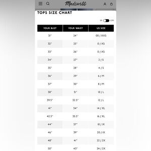 @jnle50 Hello friend. I’m not home right now but I just posted the madewell tops size chart for you on this listing. Hope that helps. Have a great day!