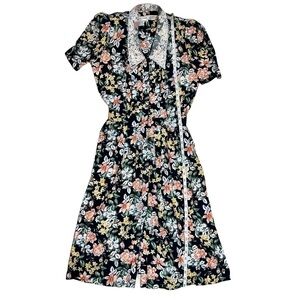 Modern and sweet floral midi dress with a delicate lacey collar detail