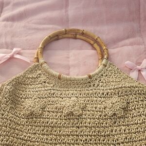 Chic Esprit woven straw tote bag featuring natural bamboo handles and a charming floral crochet detail on the front. Fully lined with blue gingham fabric and includes an interior zip pocket plus magnetic snap closure.