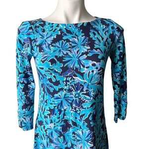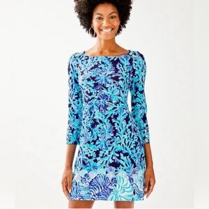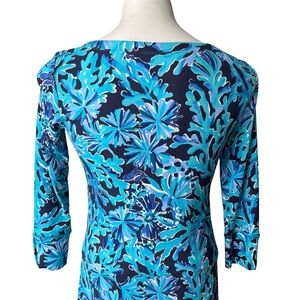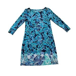 Embrace the vibrant coastal allure with this stunning Lilly Pulitzer shift dress. Its eye-catching blue coral print evokes the magic of the ocean, perfect for bringing a splash of paradise to your everyday style. Designed with a flattering silhouette and three-quarter sleeves adorned with decorative gold buttons, this dress offers both comfort and chic sophistication. The smooth, breathable fabric feels wonderful against your skin, promising effortless wearability all day long.