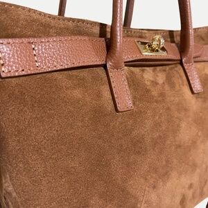 Genuine Italian suede fringe tote with a structured silhouette and soft, supple feel. Fringe detailing runs along the front and back seams, adding texture and movement without overwhelming the design.