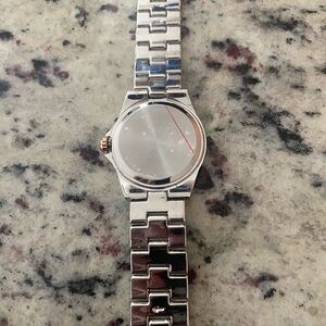 Stylish watch with a silver band and rose gold accents. Ideal for any occasion.