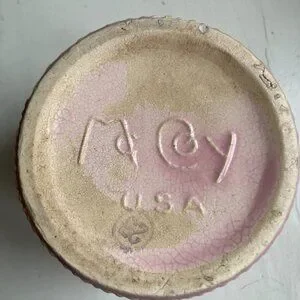 The McCoy Pottery Flower Pot Planter is a vintage piece with a charming pink Basket Weave pattern, perfect for indoor and outdoor use. Made of clay in the United States in the 1950s, this round planter has a mid-Century Modern style. With a height of 5” and a width of 5.5". Some inside wear consistent with age (see photo) but the outside looks beautiful.