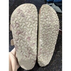 Birkenstock Arizona sandals are the easy win for everyday comfort. The beige textile/canvas upper keeps the look clean and casual, while two adjustable buckle straps let you dial in the fit. Underfoot, the contoured suede-lined cork footbed supports you from quick errands to long walks. Perfect for casual weekends, travel days, and laid-back summer hangouts. Pre-owned: well loved but plenty of life left.
