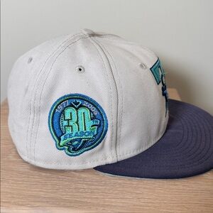 New Era Toronto Blue Jays 59FIFTY fitted hat with a light-colored crown and a navy blue brim, featuring the "T-bird" logo in teal and light blue