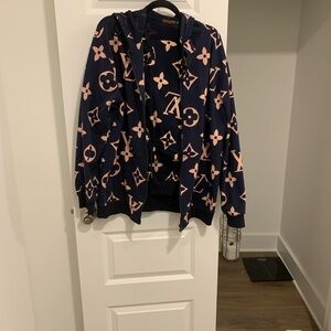 Unisex Chic Louis Vuitton hooded tracksuit with signature monogram. Dark blue base with cream accents.