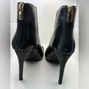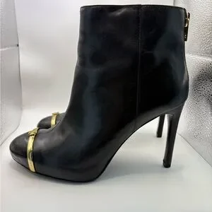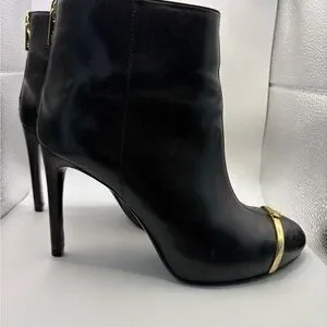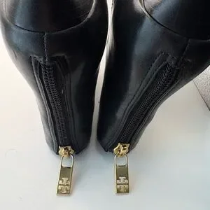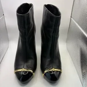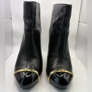 EUC. Authentic Tory Burch. Very sexy bootie! Sleek black booties with chic gold TB detailing. The Pacey ankle bootie combines smooth leather with a glossy patent caped toe. The Tory Burch logo can be seen on the cap toe as well as the zipper pulls. The stiletto heel is approximately 3 1/2 to 4 inches. Minimal ware/imperfections can be seen in the pictures. The first picture is a stock photo for model visualization only. Comes with an authentic Tory Burch dust bag. Smoke free home. Fast shipping. Five star seller ⭐️⭐️⭐️⭐️⭐️