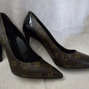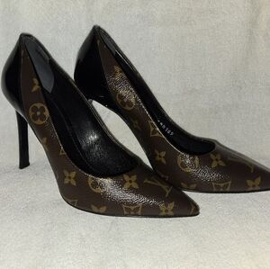 Beautiful condition Chic Louis Vuitton heels in brown and black. Stylish and versatile for any event. soles show very little wear. Includes a tan fabric bag for storage.