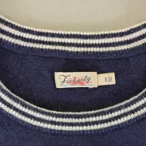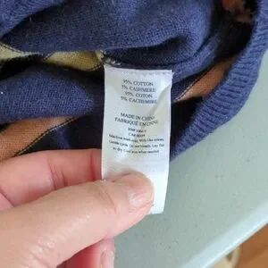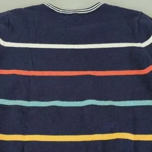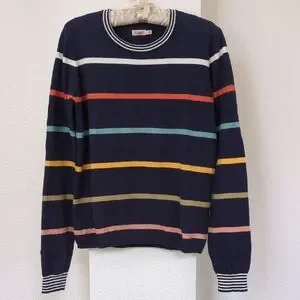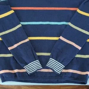 Navy sweater with vibrant multicolor stripes. Soft and cozy. Perfect for everyday wear. Crewneck, long sleeves. No rips tears or stains. smoke and pet free home.