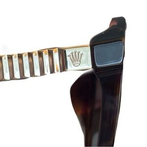 Vintage authentic Rolex women’s sunglasses in a classic tortoise cat-eye silhouette. This discontinued Rolex style is highly collectible and no longer produced. Gold plated, bracelet style arms with inset Rolex crown logo on the temples.