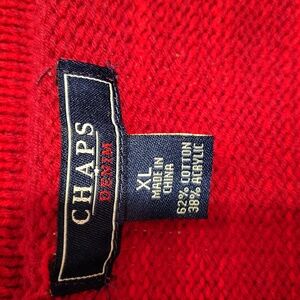 Unique Chaps intense red sleeveless cardigan with bold geometric pattern. Open front with single silver button closure. Excellent for layering. No flaws found. You will definitely make a statement walking into a room wearing.this unique cardigan, be it with jeans or withblack or beige dress pants!
