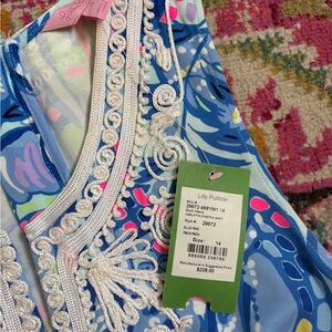 Chic and colorful dress by Lilly Pulitzer. Features a lively blue pattern with white accents. Perfect for a summer day.