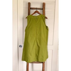 Eileen Fisher sleeveless midi shift dress in an olive green hue. The dress features a simple round neckline, a back button closure, and convenient side pockets. Its versatile silhouette makes it a great layering piece or a standalone statement.Pre-loved in good condition.