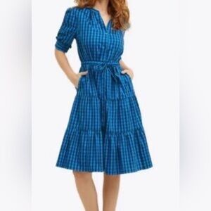 Chic blue gingham midi dress with a tie waist. Perfect for casual outings. Puff sleeves with mini ruffle accent. Pockets and self tie belt accent a tiered skirt.