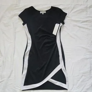 Chic mini dress with a sleek black and white design. Perfect for a night out.