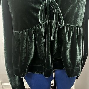 Luxurious velvet blouse in deep green. Features a tie-front and gathered sleeves. Perfect for elegant occasions. Never worn. Tags attached.