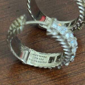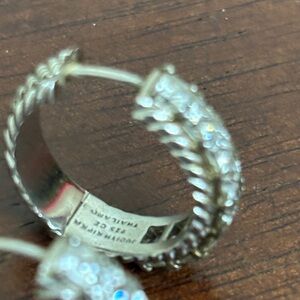 Stylish silver hoops with textured design. Sparkling accents add elegance.