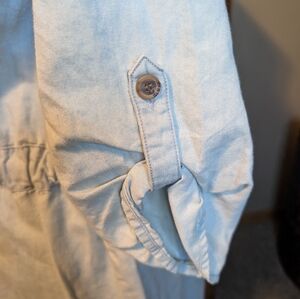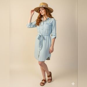 Buttery soft light blue denim dress features flap pockets, button front, roll sleeves, timeless and comfy!