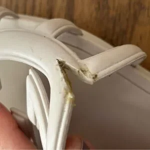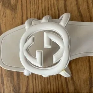 Elegant Gucci sandals. Features white straps with iconic logo. Perfect for summer wear. Small rips and tears on both sandals( Gucci store in my area was willing to fix for a small price) Very sleek and classy. Authentic Gucci slides perfect for the spring or summer events. FINAL SALE NO RETURNS PLEASE SEE ALL PICTURES. Shoes true to size. No box or dust bags, SHOES ONLY!!