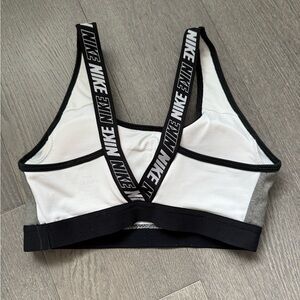 Nike sports bra with bold logo. Black, white, and gray color scheme. Ideal for active wear.