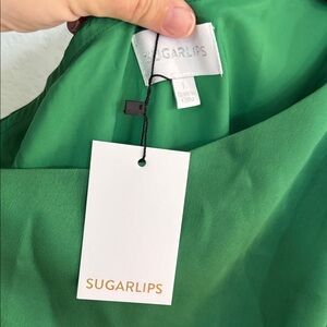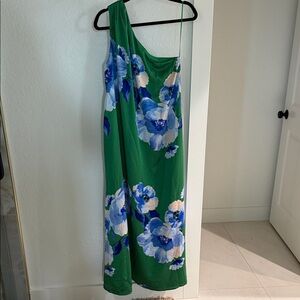 Chic one-shoulder dress with bold blue floral design on a green background. Silk material. Over right shoulder. Flowy! Has pockets!!!