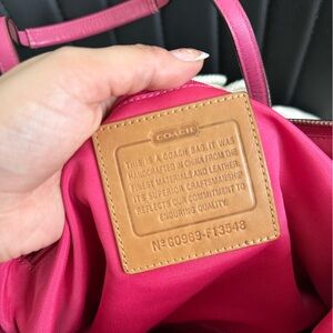 Stylish vintage Coach tote with signature pattern. Features vibrant pink accents. Perfect for daily use.