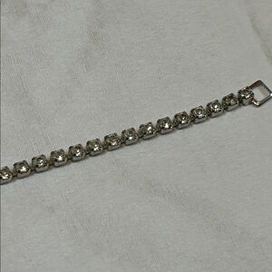 The necklace is a choker-style bib design, featuring multiple tiers of clear rhinestones in a silver-tone setting.