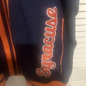 The Mitchell & Ness Jacket is a men's large varsity jacket in navy blue with orange accents, featuring a full zip closure and a ribbed hem. This collegiate-style jacket is designed with zip pockets and a durable polyester outer shell and lining, suitable for casual occasions in the fall season. The jacket is adorned with the Syracuse team logo and is machine washable for easy care. Perfect for fans of Syracuse college sports, this jacket adds a touch of nostalgia and style to any outfit.
