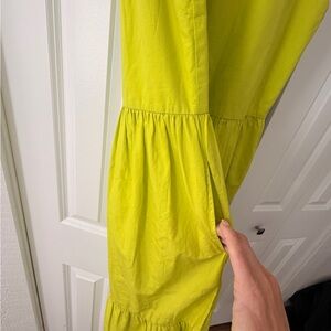 XS but fit me a size 4. Brighten your wardrobe with this stunning lime green sleeveless maxi dress. Perfect for any occasion, this dress offers both style and comfort with pockets too. There are some slight wear marks but nothing major and can be cleaned or used for layering.