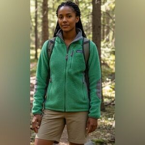 This preowned item is a Patagonia Women's R2 Regulator Fleece Jacket in the color Brilliant Green. It is a technical midlayer designed for high-output activities, featuring a high-loft Polartec Thermal Pro fabric that provides warmth, breathability, and quick-drying capabilities.